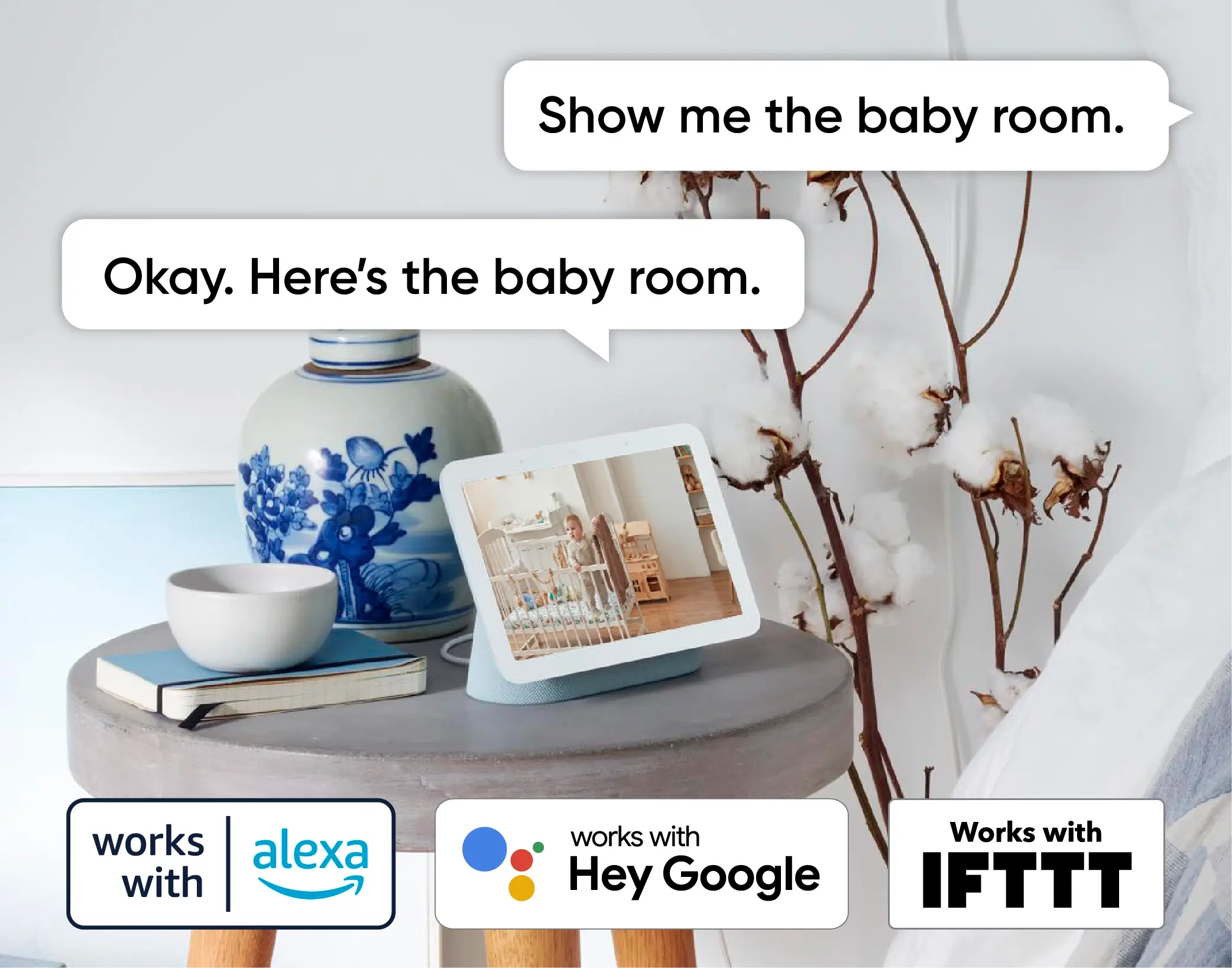 Ve y escucha a tu bebé con tu asistente de voz favorito. Conéctate y visualiza fácilmente desde cualquier habitación.