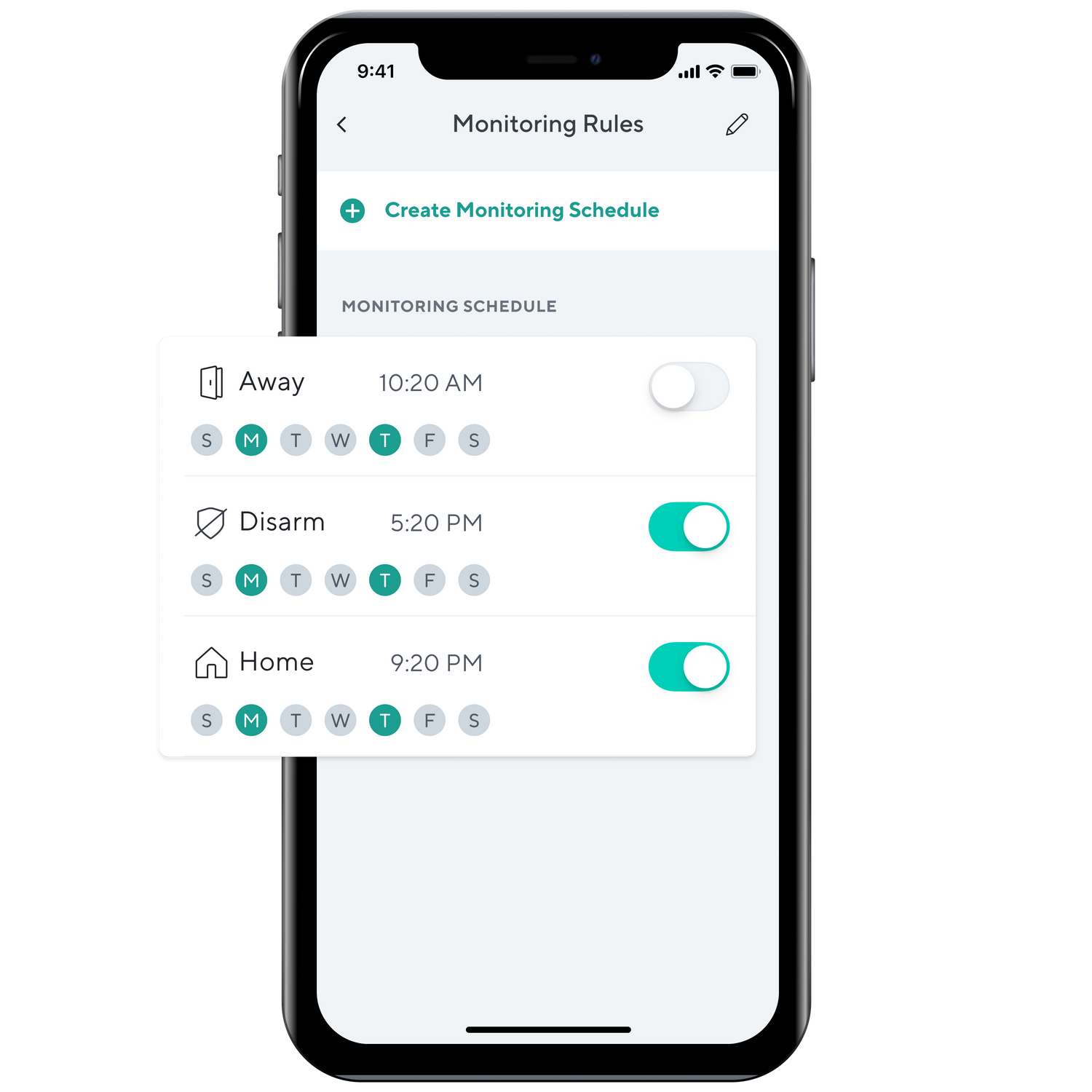 Create arming/disarming schedules to automate your home security. Never wonder if you forgot to disarm your system again.