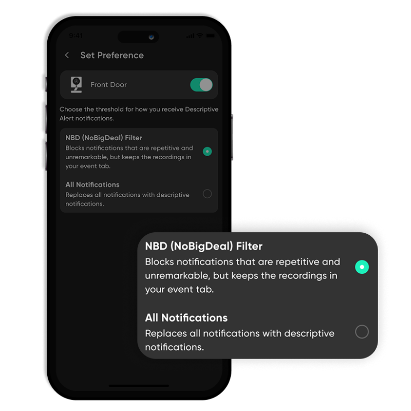 The NBD Filter uses AI to identify repetitive, everyday events that are "no big deal" and remove them from your feed. Think about the noise you get from notifications about parked cars and trees swaying in the wind.