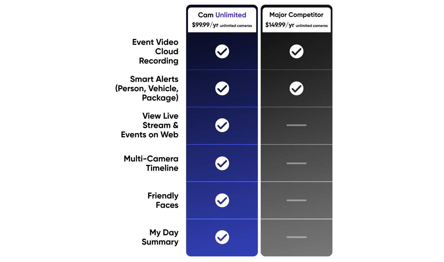 Simple (yet powerful) security that won't break the bank. Enhance all of your Wyze cams with one Cam Unlimited plan.