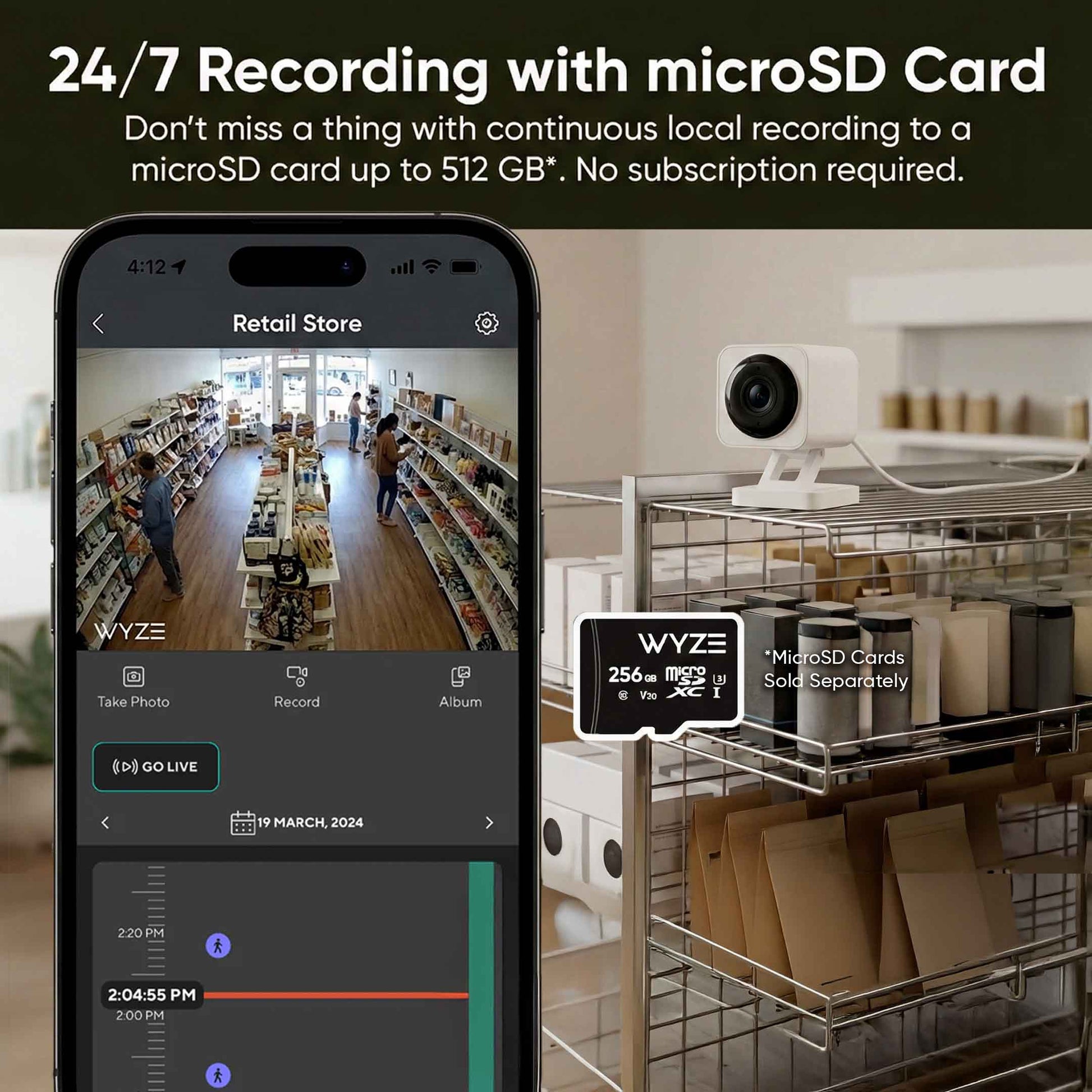 Get around the clock local recording for free with your Wyze Cam with the included 128GB MicroSD cards (4). Simply setup your settings inside of the Wyze app. That's it. Now you can access playback footage through the app or physically remove the card to access the files on your computer.