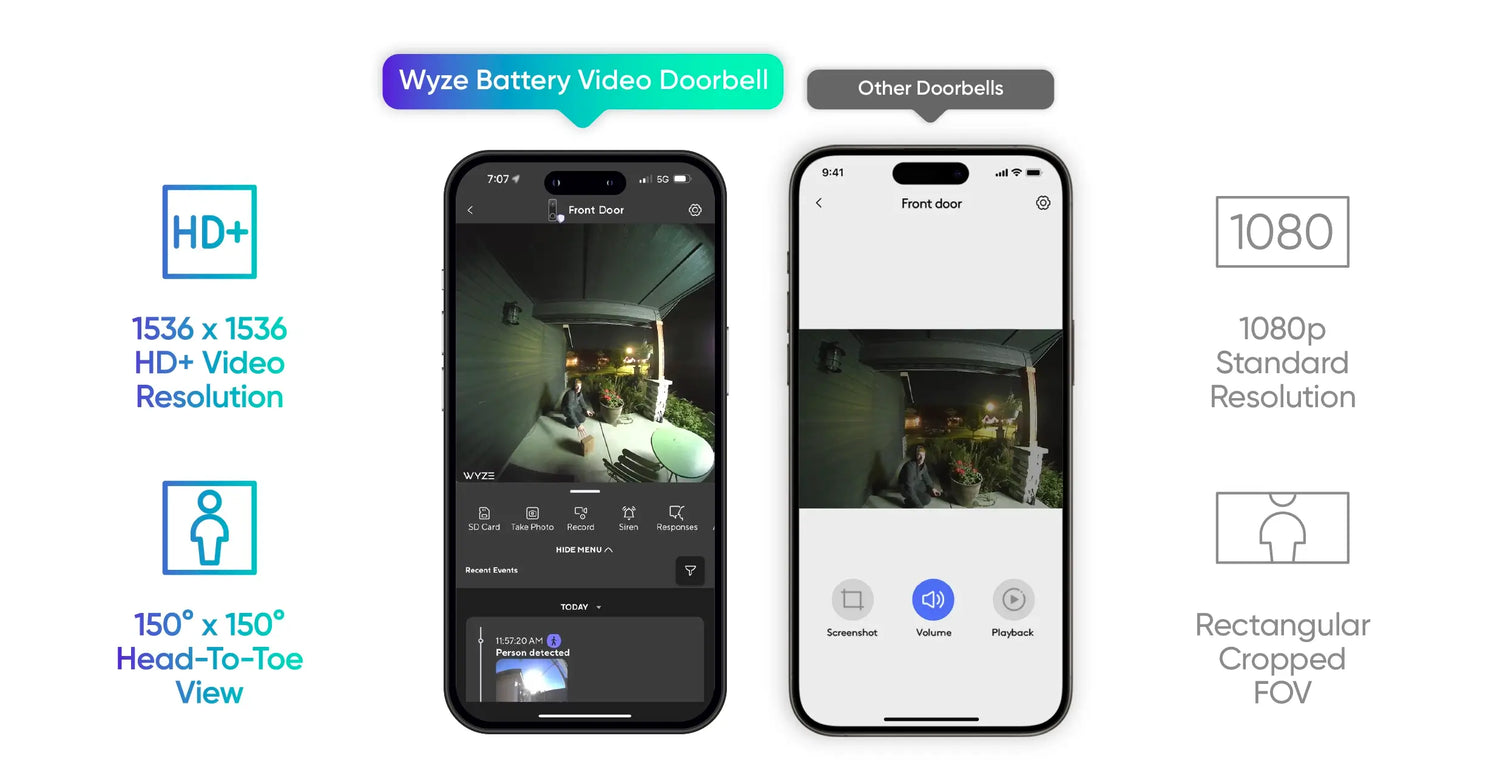 See more of what matters. With a 150° horizontal and 150° vertical field of view, Wyze Doorbell captures everything from a visitor’s smile to a package tucked against your door.