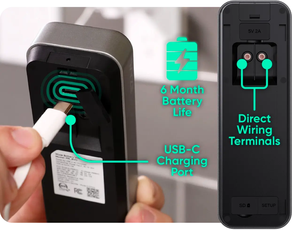 Go up to 6 months on a single charge, or hook it up to your existing doorbell wiring for nonstop power. Recharging is easy, just plug into the USB-C port on the back.