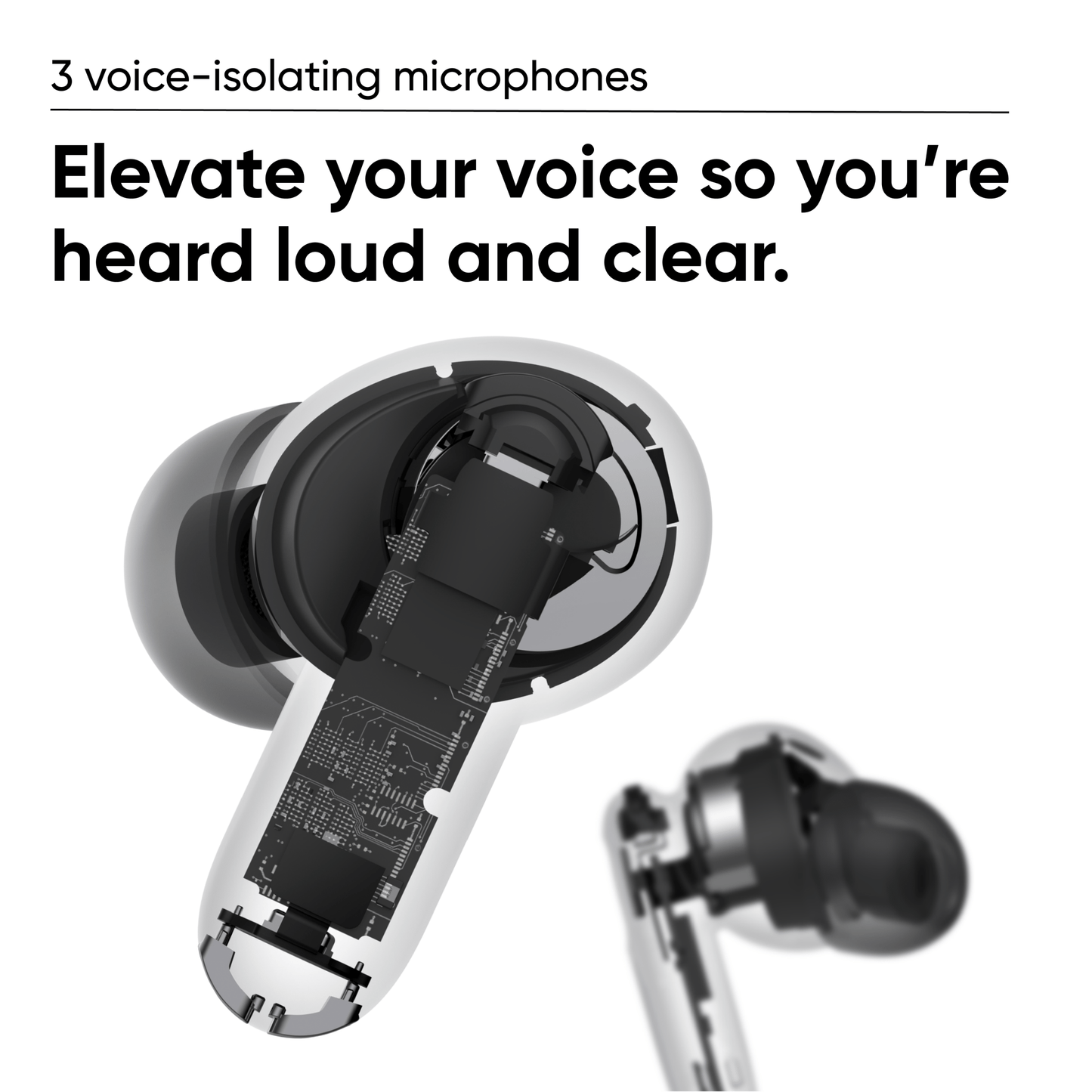 Three microphones per bud work together to elevate your voice and cut the noise so you are heard loud and clear.