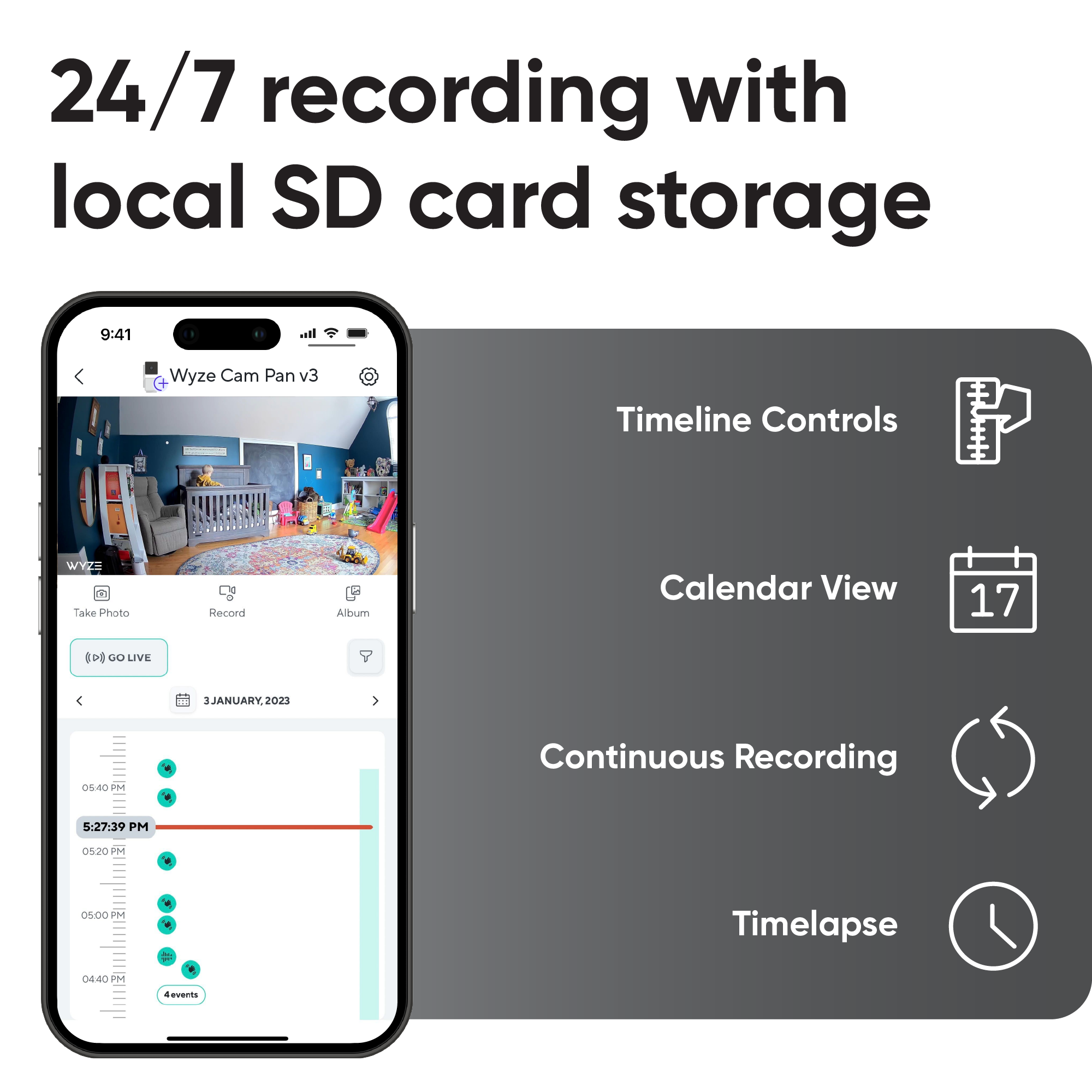 • Smartphone with Wyze App open. Text overlay that says "24/7 recording with local SD card storage."