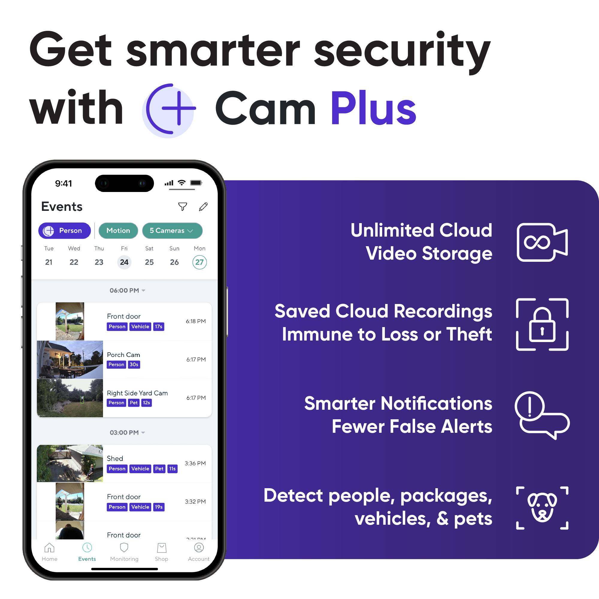 *Cam Plus subscription auto renews at $2.99/month/cam after the first month. No commitment, cancel anytime. Plan is not compatible with existing Cam Plus Unlimited plans.