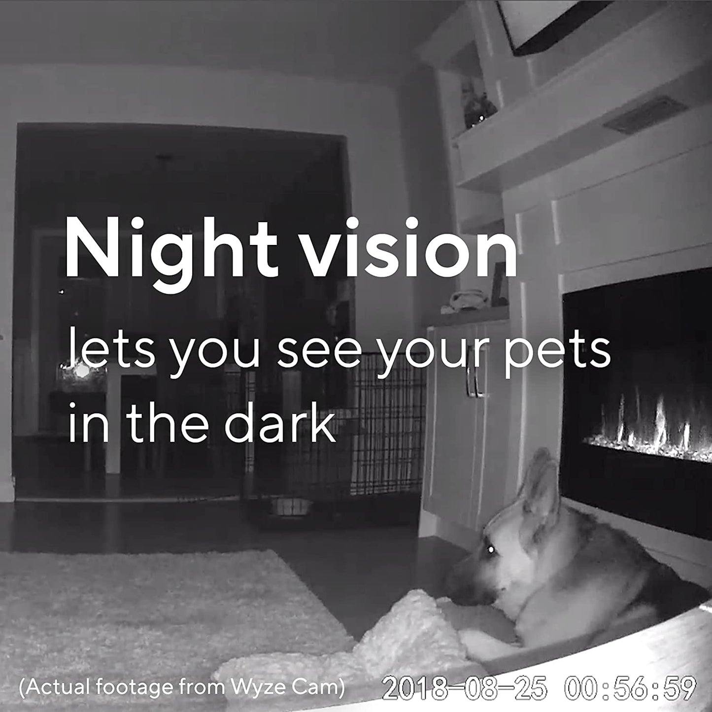 With F2.0 aperture, IR-CUT filter, and four 850nm infrared LEDs, WyzeCam’s enhanced night vision delivers clarity up to 30 feet away even in total darkness.