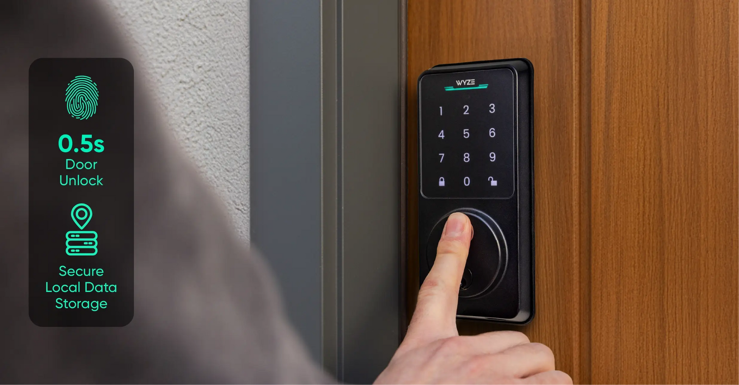 Wyze Lock Bolt v2 uses a biometric fingerprint scanner to unlock your door in as little as 0.5 seconds, storing your fingerprint data locally on the lock—not in the cloud—so you can ditch keys without sacrificing security when you’re carrying groceries, kids, or luggage.
