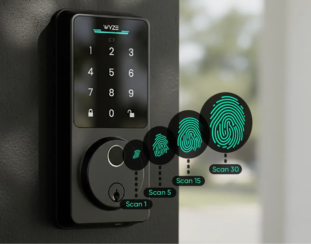 Wyze Lock Bolt v2 uses an AI self-learning fingerprint scanner that updates your profile with every touch, adjusting for pressure, angle, and tiny skin changes.