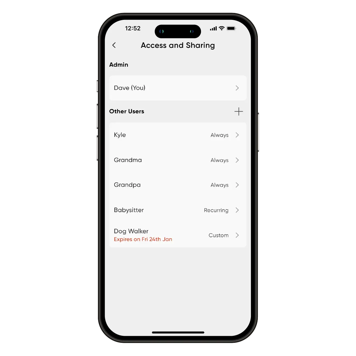 Tap the illuminated glass keypad to create and store up to 50 unique access codes for family, friends, and trusted visitors—or set one-time guest codes that automatically expire on the schedule you choose, perfect for cleaners, Airbnb guests, or a neighbor feeding the cat while you’re away.